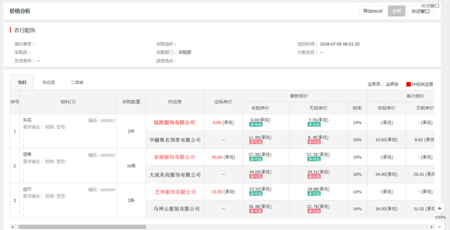 在供应商进行报价时,并生成二维表进行比价,避免了采购员与供应商沟通时信息传递不流畅造成的误买、的状况,系统会自动记录供应商上报的价格,使得采购效率得到了一定的提升。