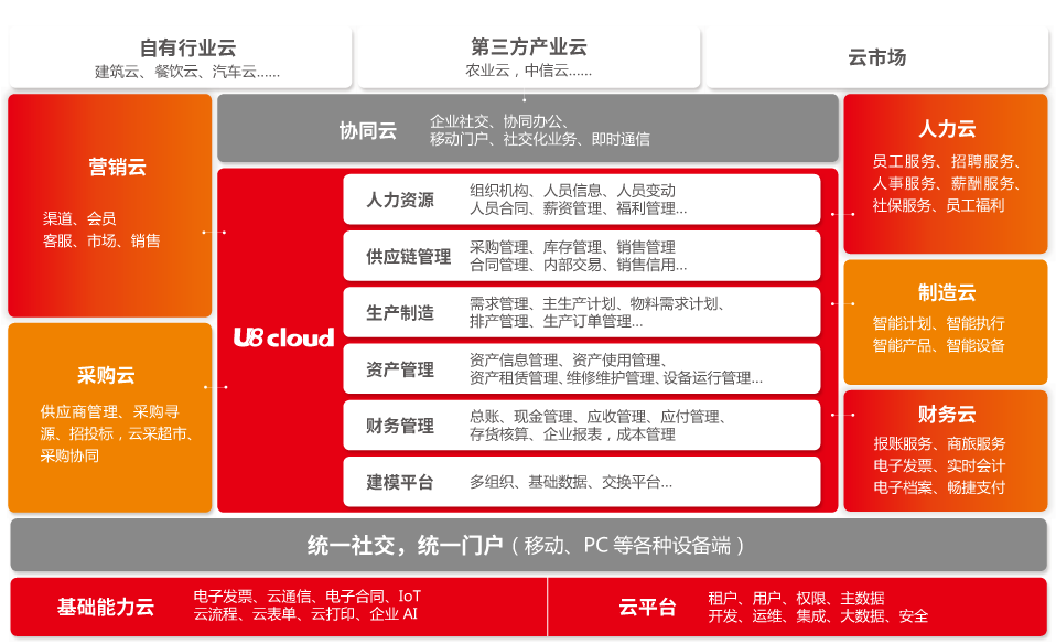 全面支持多组织业务协同、营销创新、智能财务,人力服务、构建产业链智造平台