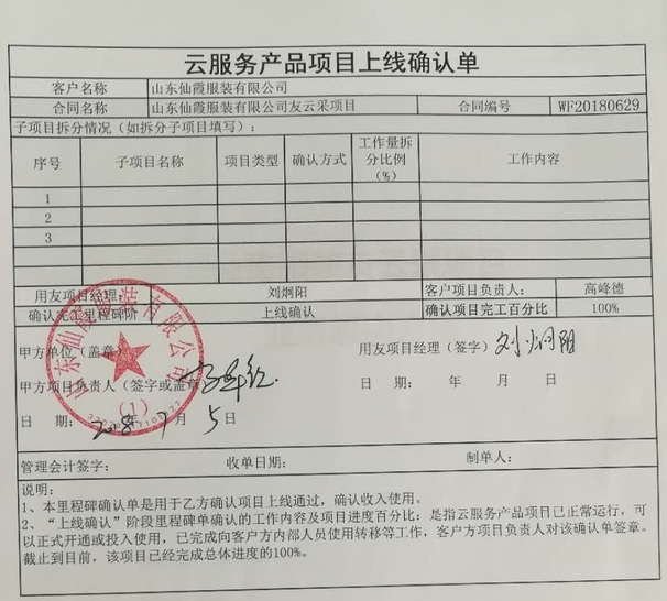 此次项目进展可以说是有“两快”:签约快,一次远程演示,一天内签约;上线快,两天内快速上线,公有云项目,无需部署,即开即用。正是山东仙霞服装有限公司标准的业务需求与友云采完全成熟的产品的“一拍即合”,才使得此次项目进展如此之快,同时也得到了山东仙霞服装有限公司的大力认可和赞扬。
